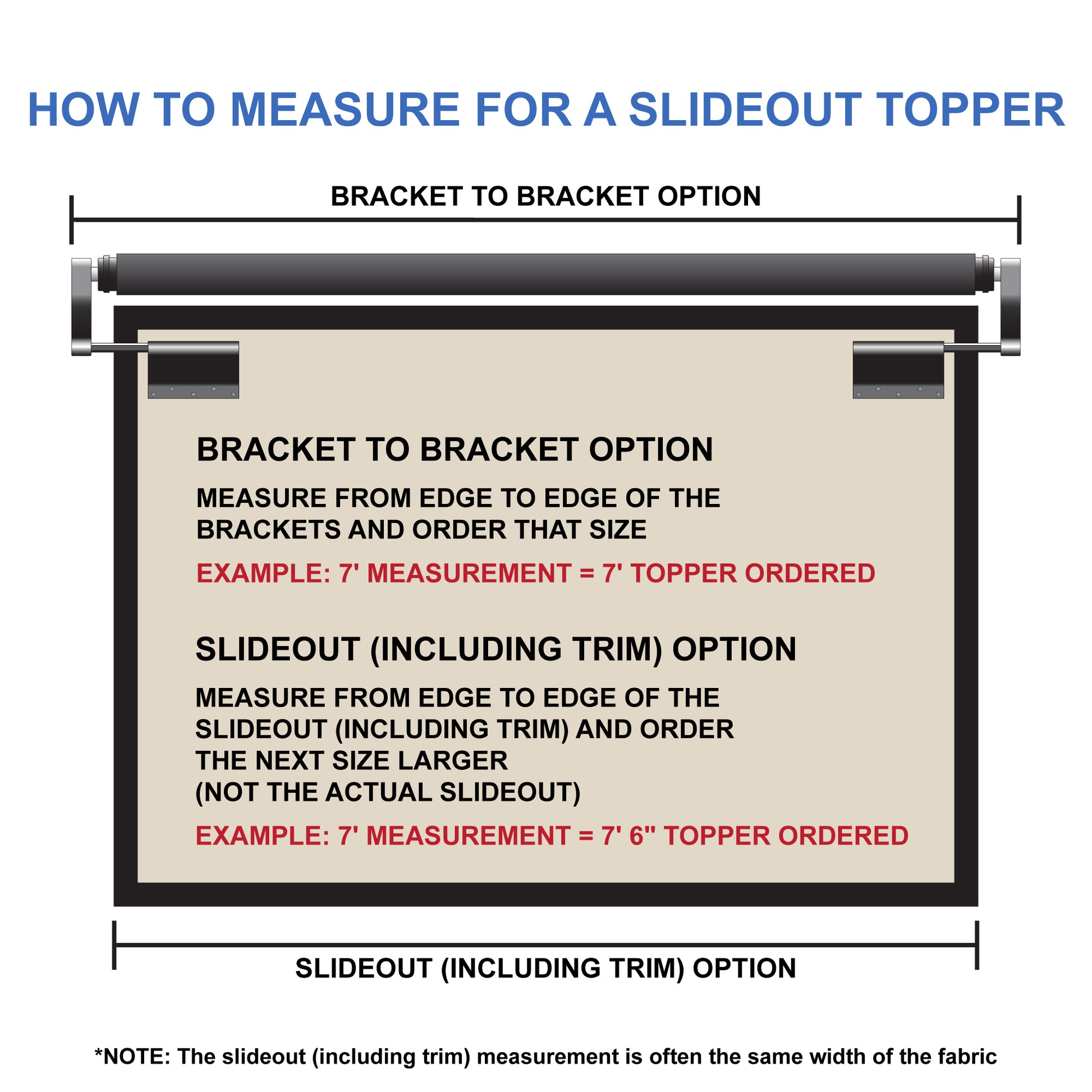 Nobody likes dealing with issues in their RV. It can be a costly repair, especially if you find yourself needing to work on your slide-out. But everything goes through wear and tear, and you want to extend the life of your slide-out, which means shopping for a stylish layer of protection. Choose RecPro's Slide-Out Topper Cover to protect from various weather conditions. Made from industrial-grade 1000 PVC tarpaulin, this slide-out topper is built to endure the elements for long-lasting protection. With a high tensile strength of 140 PSI, you can rest assured that the awning fabric will resist tearing, puncturing, and ripping, even in heavy wind or storm conditions. The white fabric is UV-resistant to block sun damage and heat buildup, and with a B1 flame-retardant rating, you'll be investing in enhanced safety in high-temperature environments. This product is designed to extend and retract automatically with your RV's slide-out, offering reliable, hands-free protection against rain, sunlight, and leaves. By preventing water from pooling and debris from accumulating on your roof, it reduces the risk of seal damage, mold growth, and structural wear. We offer this product in widths ranging from 5'6" up to 14', each width coming with appropriately sized fabric to ensure proper tension and full coverage. The consistent 48" depth will provide ample overhang to block direct sunlight and falling debris, making it adaptable to a wide range of slide-out configurations.