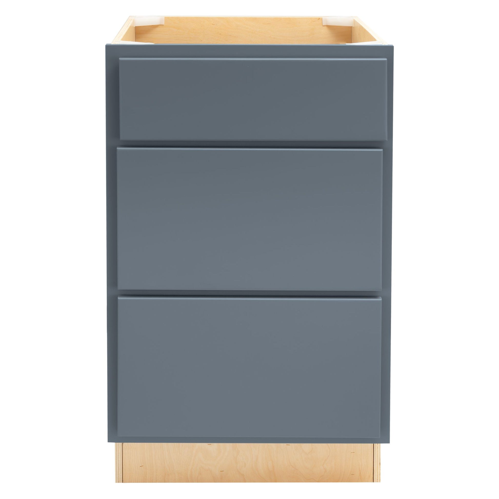 Home is where the heart is, whether you're spending time at the house, in a camper, RV, or mobile home. Whether it's limited or tight spaces, you want to make the most out of everything. Style, storage, and functionality. Those are the three keys to a perfect home. For those interested in a darker color, something sophisticated and modern, you'll want to check out Factory RV's Needlepoint Navy cabinets. More importantly, our Needlepoint Navy 3-Drawer Base Cabinet will be a vital, versatile investment for any bedroom, bathroom, kitchen, or laundry room. The 3 full extension drawers will offer ample storage for your pots, pans, towels, utensils, cleaning supplies, toiletries, or other essentials. With soft-close hardware, you can eliminate loud noises, slamming drawers, wear and tear on the cabinet, and extend its life. For added protection, we coat the interior with a water-resistant UV finish, ensuring resistance to spills, stains, moisture, or humidity, making this base cabinet essential for RV conditions or high-use areas. If you're still wondering what makes Factory RV so special when you're cabinet shopping, you'll be pleased to know that our cabinets are made in America with quality Amish craftsmanship. That means investing in a premium product designed with attention to detail, precision, and long-lasting durability and reliability. Made of 100% natural wood with ½" birch plywood drawers and frames, this base cabinet is engineered to withstand the rigors of RV travel or frequent use without warping, weakening, or cracking.