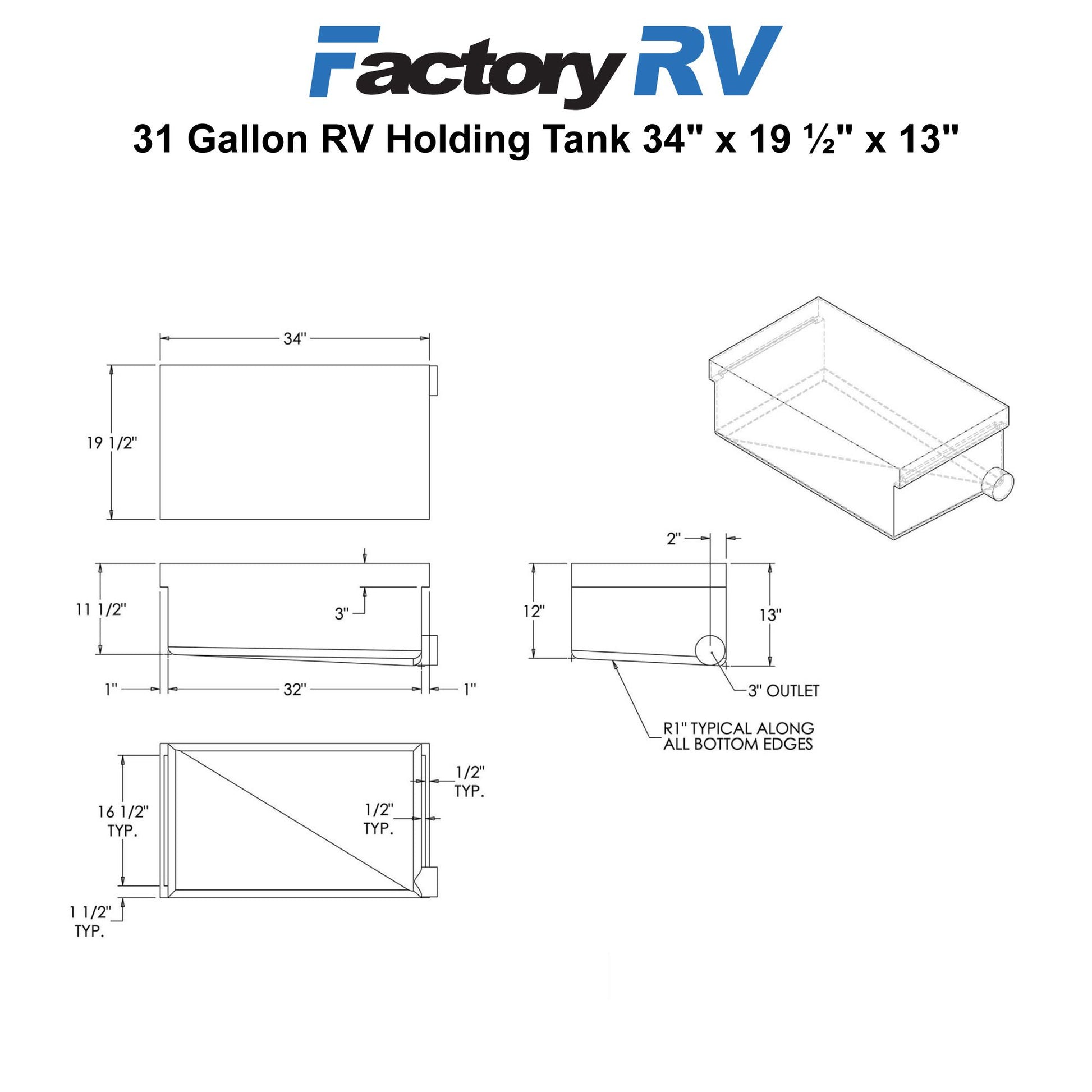 It doesn't matter how much time you spend in your RV. When nature calls, you know better than to ignore it. Waste has to go somewhere, and that's where your blackwater tank comes into play. But if your tank isn't functioning correctly because of leaks, cracks, corrosion, clogs, and buildup, that's a sign for you to replace it. If you're tired of making frequent stops because of your tank, you need to upgrade it. Regardless of what you're looking for, you'll want to invest in Factory RV's 31-gallon Blackwater Tank. This tank is crafted from high-quality polyethylene through a rotational molding process, featuring ¼" thick walls to provide superior impact resistance and long-lasting durability and reliability, even under the rigors of RV travel. The 31-gallon capacity will give you peace of mind when you want to enjoy long road trips. You can utilize this tank for black or gray water and enjoy the reduction of pit stops for dumping. Whether you're enjoying long trips or settled into off-grid life, this tank will allow you to enjoy your RV to the fullest. You'll want to invest in this blank tank if you're working with a custom setup. We offer an optional fittings kit for those who need tailored inlet, outlet, or vent placements. When you're getting ready to clean the blackwater tank, a dreaded chore, you'll be pleased to know this blackwater tank is resistant to most chemicals to ensure it remains durable and easy to maintain. The low-adhesion surface will prevent waste buildup and simplify cleaning, promoting a more hygienic RV environment.