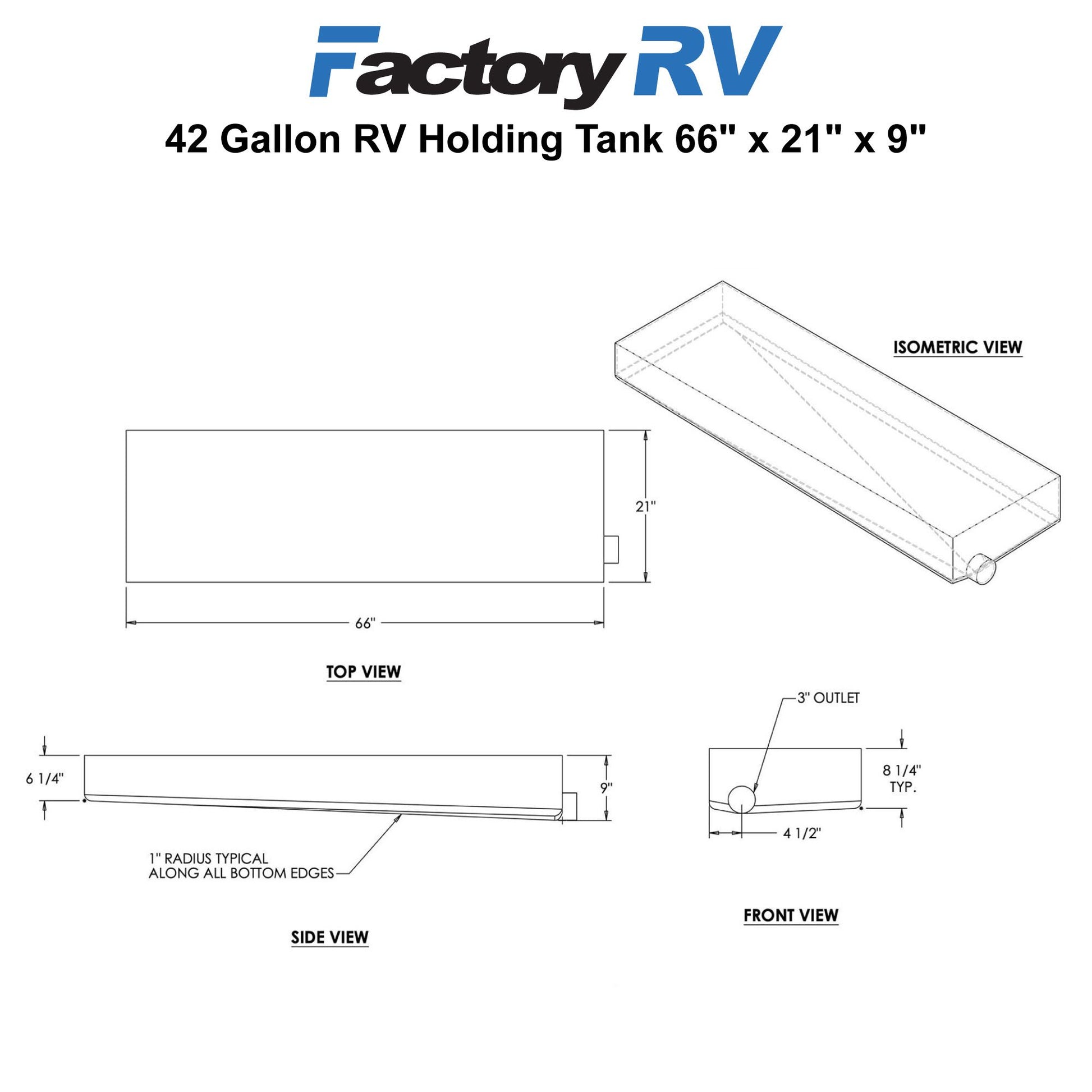 Everything in your RV goes through wear and tear from road and weather conditions or frequent use. Most things are easy to replace or upgrade to something better, and sometimes, the shopping process can be fun. But when it comes to your blackwater tank, you don't want to worry about messy situations. You want to invest in a long-term product designed for lasting durability and reliability. Good thing you found us. Factory RV's 42-gallon Blackwater will be just what you and your RV need. With a 42-gallon capacity and compact design, you'll have a generous amount of waste storage without sacrificing space, making it ideal for RVs, custom vans, or off-grid builds. The rotationally molded polyethylene construction will eliminate weak points that are otherwise prone to leaks or cracking. This tank will resist corrosion, impact, and harsh chemicals, giving you peace of mind when traveling in demanding environments. When you look at this product, you're looking at a versatile tank that can be used for black and gray water. Its low-adhesion interior surface will help minimize buildup and simplify cleanup and maintenance, and we all know how important that is to you. This blank tank will offer complete control over the setup, and an optional fittings kit will help with a smoother installation. The 3" outlet will make for efficient waste discharge, so you can rest assured that you're looking at a high-quality product for all your needs.