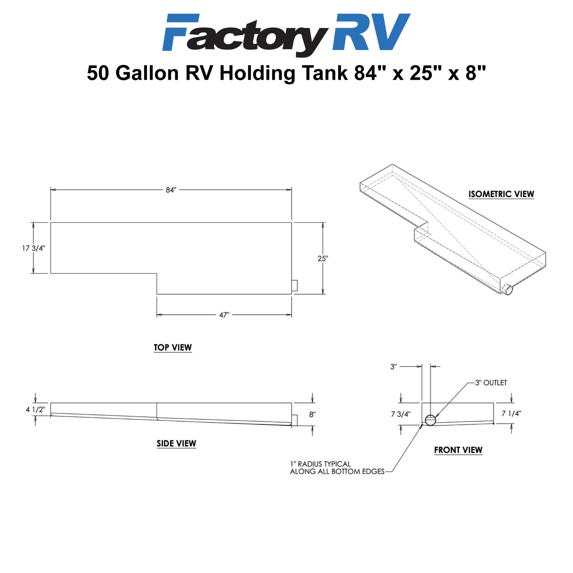 A waste tank is a must-have in your RV, whether hanging out at the campground or planning trips and off-grid adventures. It doesn't matter if you're looking at hosting family or friends; you'll need a proper waste management system. But if you hate frequent trips to empty the tank, disgusting clogs, buildup, or time-consuming maintenance, that might be your sign to start shopping for a new blackwater tank. Treat yourself to an upgrade with Factory RV's 50-gallon Blackwater Tank. The 50-gallon capacity will provide a generous amount of capacity, while the slim profile makes this tank ideal for undercarriage mounting or compact RV installations. The built-in sloped design will promote thorough emptying with the aid of gravity, reducing the likelihood of residual waste and minimizing odor retention, giving you peace of mind when you're enjoying time in your RV. This tank is blackwater specific, designed to handle heavier solids and more aggressive waste typically found in sewage systems. The durable roto-molded polyethylene will give you peace of mind when looking for long-term reliability and durability; this blackwater tank resists leaks, impacts, and chemical damage. In addition, the low-adhesion interior will help resist buildup, make cleaning easier, and improve long-term system efficiency. The ⅛" thick walls will ensure structural integrity even under frequent or heavy use. Make installation easy without sacrificing strength with this tank's lightweight yet durable design. As a blank tank, you'll have complete control over the customization of the placement of inlets and outlets.