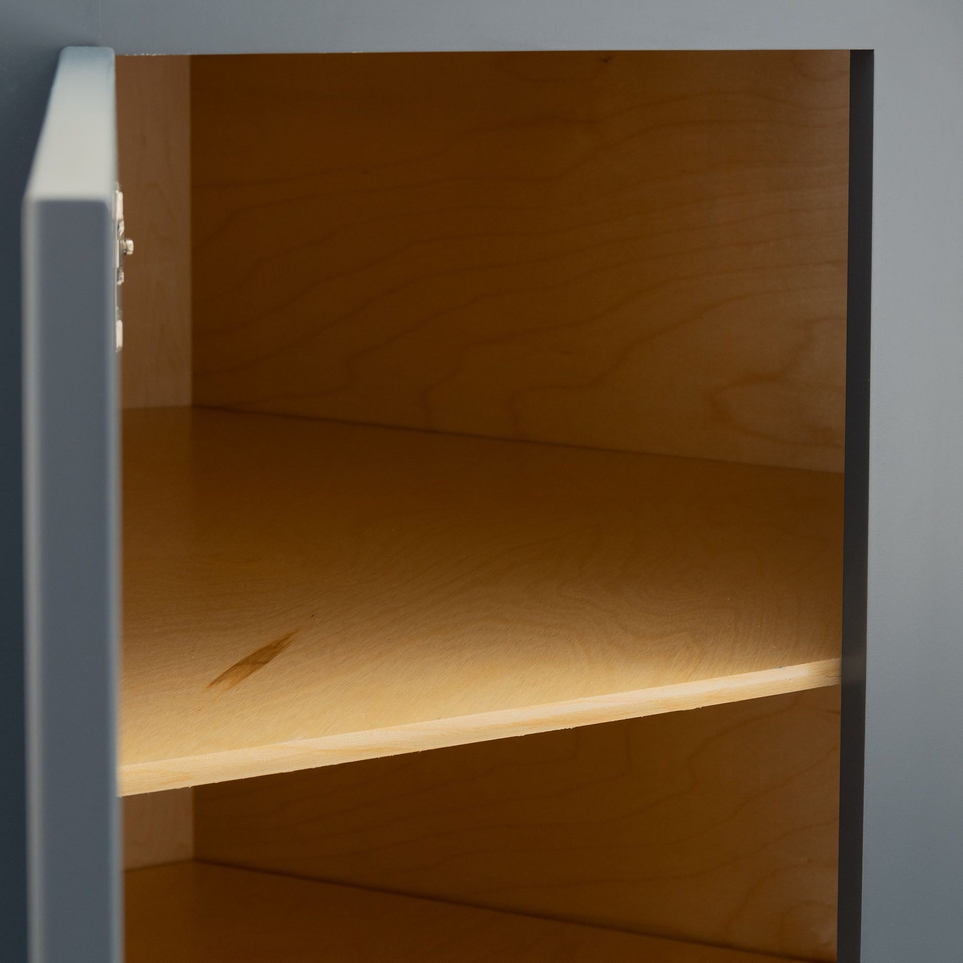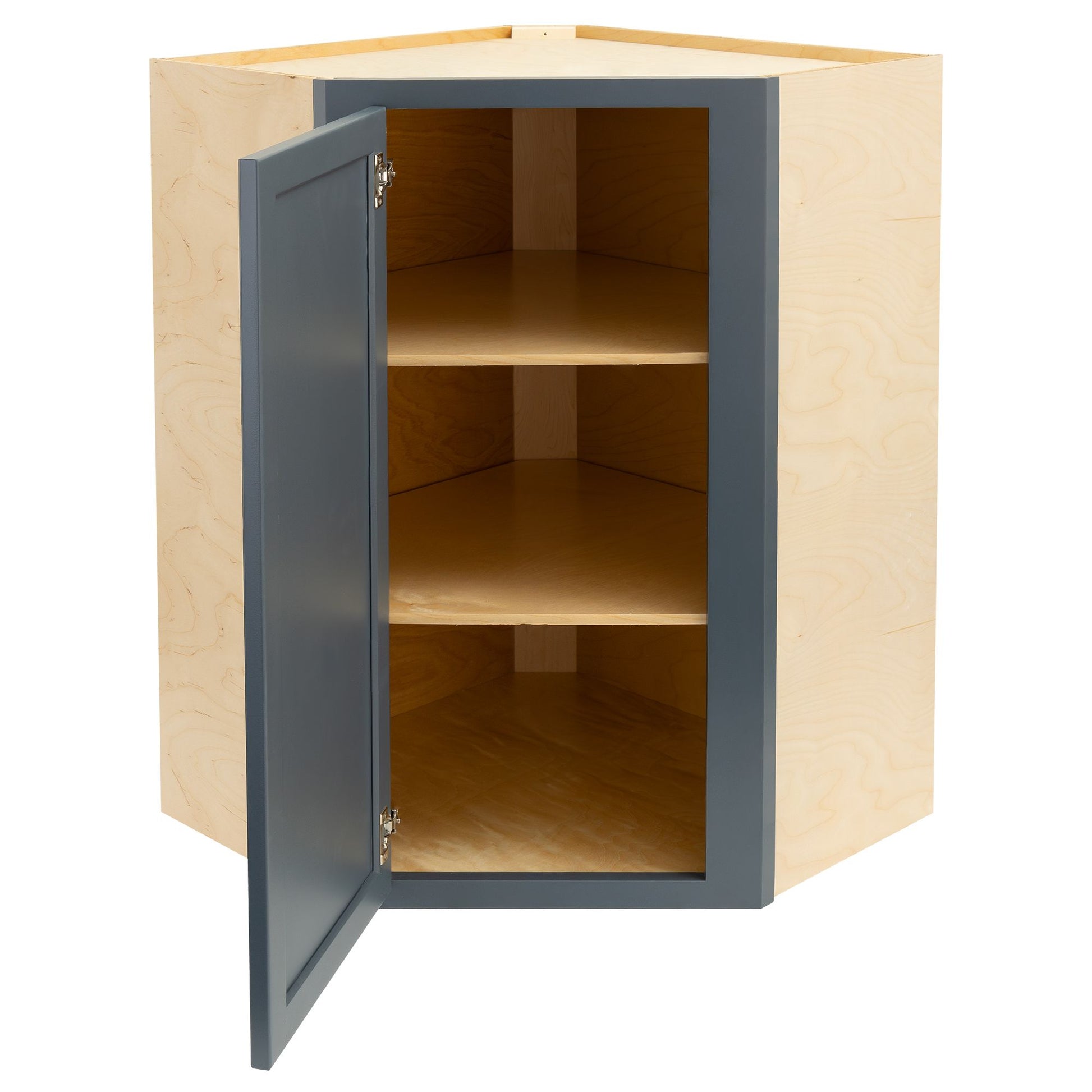 Cabinets are an excellent investment for any house, mobile home, camper, RV, or trailer. Whether you're creating a workspace, modern style, or farmhouse vibe, you can get creative and build the perfect setup for style, functionality, and storage. When you're shopping for cabinets, make sure you choose Factory RV for quality products. Our Needlepoint Navy Corner Wall Cabinet will create easy access to the corners of your space and maximize the storage space you need. The needlepoint navy stain will offer a bold color to complement modern or transitional interiors. It's 100% natural wood construction and ½" birch plywood doors and frames ensure superior strength, resistance to warping, cracking, vibration, and frequent use for long-lasting reliability. Made in America with Amish craftsmanship, you can pride yourself on shopping locally for products designed with exceptional build quality, structural precision, and attention to detail. Our corner wall cabinet is built with a single door and soft-close hardware, preventing slamming, loud noises, or wear and tear on the hinges for added protection. The two ½" shelves offer ample storage for organizing plates, cups, bowls, cookware, tools, cleaning supplies, or other essentials as you see fit. In addition, the interior of this cabinet is coated with a water-resistant UV finish to protect against spills, stains, moisture, and sunlight, making it ideal for high-use and humid environments.