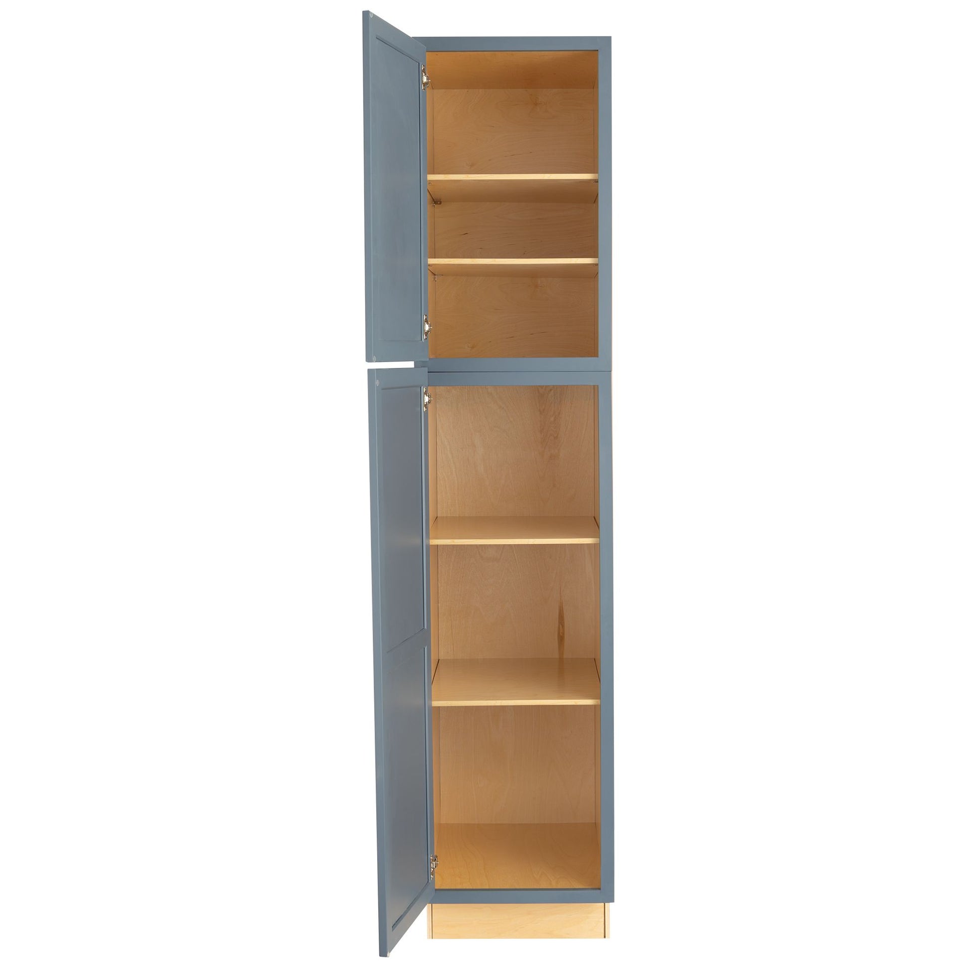 A pantry cabinet is a must-have in your home, whether mobile or stationary. It's a cabinet filled with snacks, drinks, food, and dried goods. Whether you're trying to prolong the time between shopping trips or planning long trips, you won't want to miss out on Factory RV's Needlepoint Navy Pantry Cabinet. Made with 100% natural wood with ½" birch plywood doors and frames, you can rest assured that you're investing in long-lasting strength, dimensional stability, and a clean and professional finish superior to particleboard or MDF alternatives. With a needlepoint navy finish, you can enjoy a bold, refined look that complements various design styles from coastal and farmhouse to modern and minimalist. With four ½" shelves, you'll have ample storage space to organize as you see fit. With a water-resistant UV-coated interior, you won't have to worry about spills, stains, moisture, or humidity damaging the pantry. Enjoy storage for dry goods, snacks, drinks, appliances, or cleaning supplies. For added protection and sophistication, we utilize soft-close hardware to eliminate loud noises, slamming doors, or wear and tear on the hinges, ensuring a premium, user-friendly feel for daily use. Our pantry cabinet is shipped in two packages to ensure safe travels, and its ready-to-assemble design makes construction and installation easy for your convenience.