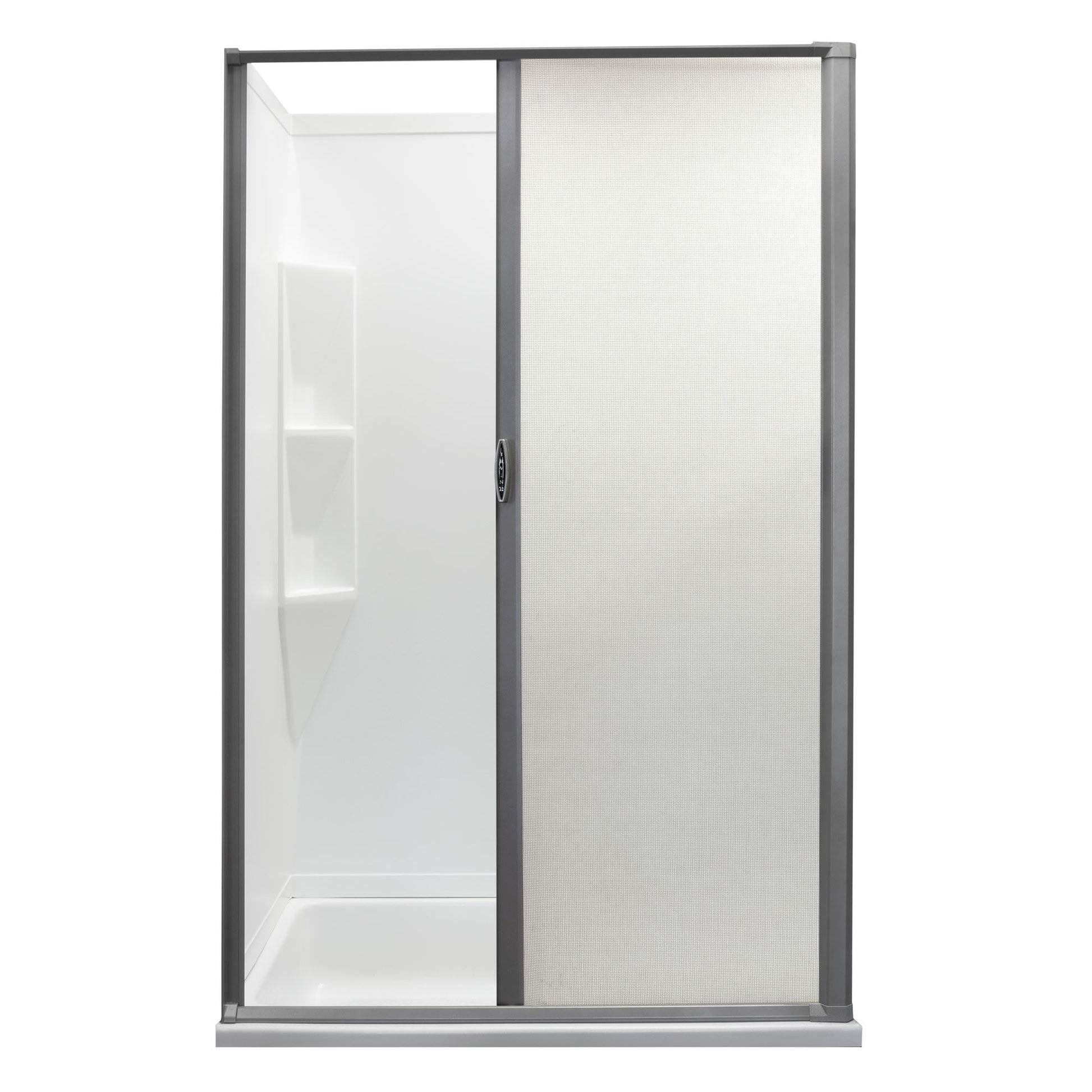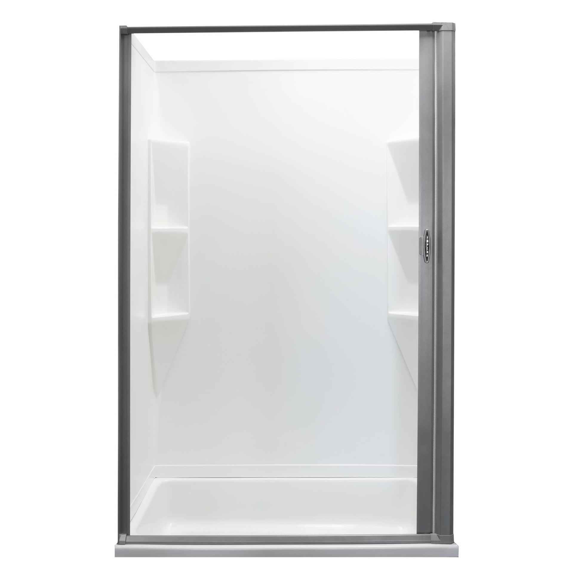 The 48" wide shower door should work just fine for you! You would just have to cut the top and bottom rails down to fit. With that being said, I recommend measuring multiple times before cutting them because any modifications will waive the 1-year warranty that these have.