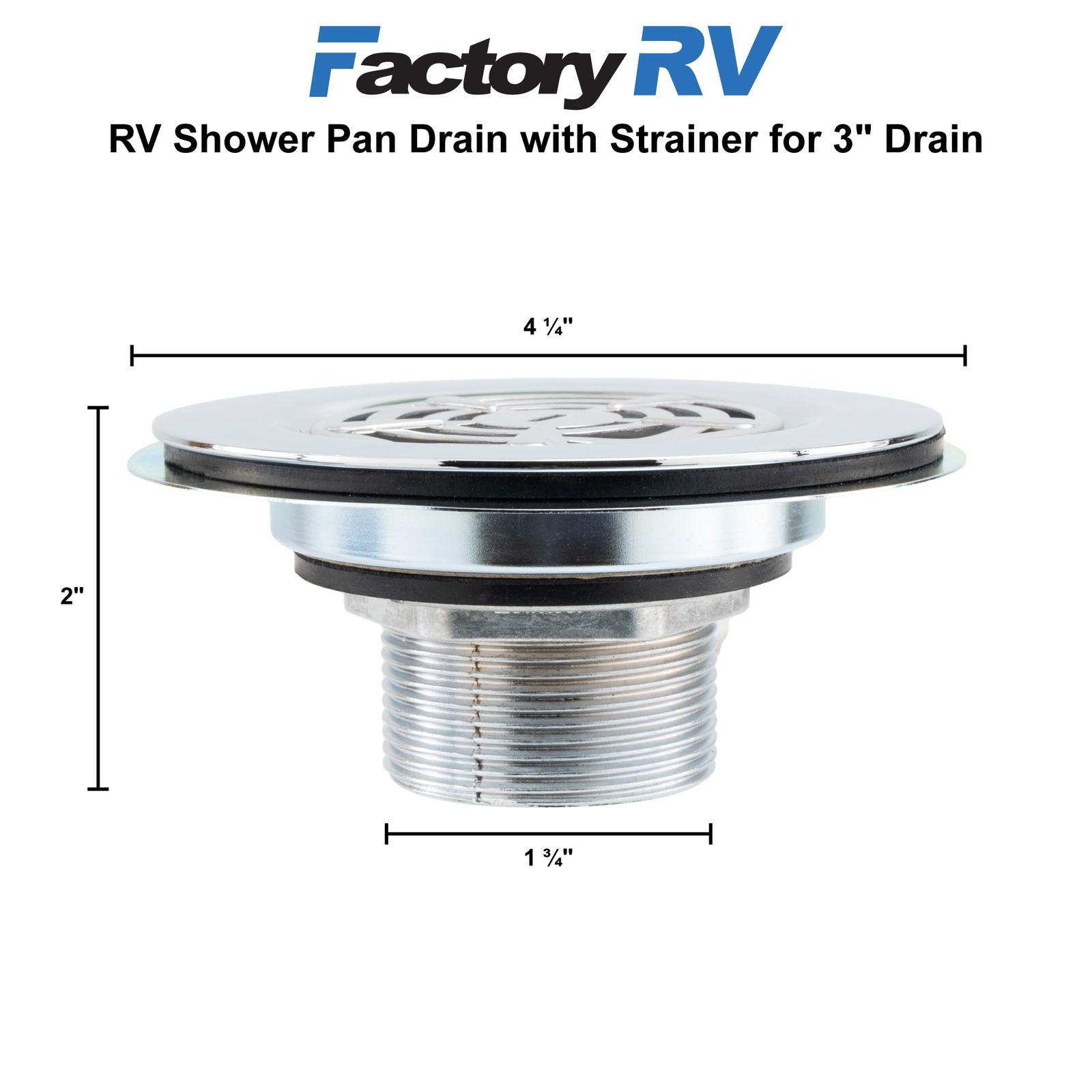 You've invested in a shower pan to keep your floors dry and enjoy the peace of the bathroom. But now you're just missing one final piece to complete the bathroom. Obviously, we're talking about Factory RV's Shower Pan Drain. In your RV, the bathroom is a chance to get clean and unwind from a long day or start the day right. But if you don't have a proper drain for your shower pan, you're risking issues with the plumbing. Having to fix those issues down the road will cost you a pretty penny, but investing in an immediate protector is simpler. Our shower pan drain is easy to install, so you won't need special tools or complicated instructions. Whether you're working on a new build or a replacement project, this drain will solve all your plumbing problems. This drain is made from corrosion-resistant stainless steel, built to withstand daily exposure to water and chemicals, and ensures long-term reliability in your RV. It's designed to fit 3" shower pan drain openings and seamlessly connect with 1 ½" threaded pipes, making it a versatile solution for a wide range of RV plumbing systems. This drain features a 2 ⅝" strainer to capture debris and hair, allowing smooth water flow and preventing blockages for optimal drainage performance.