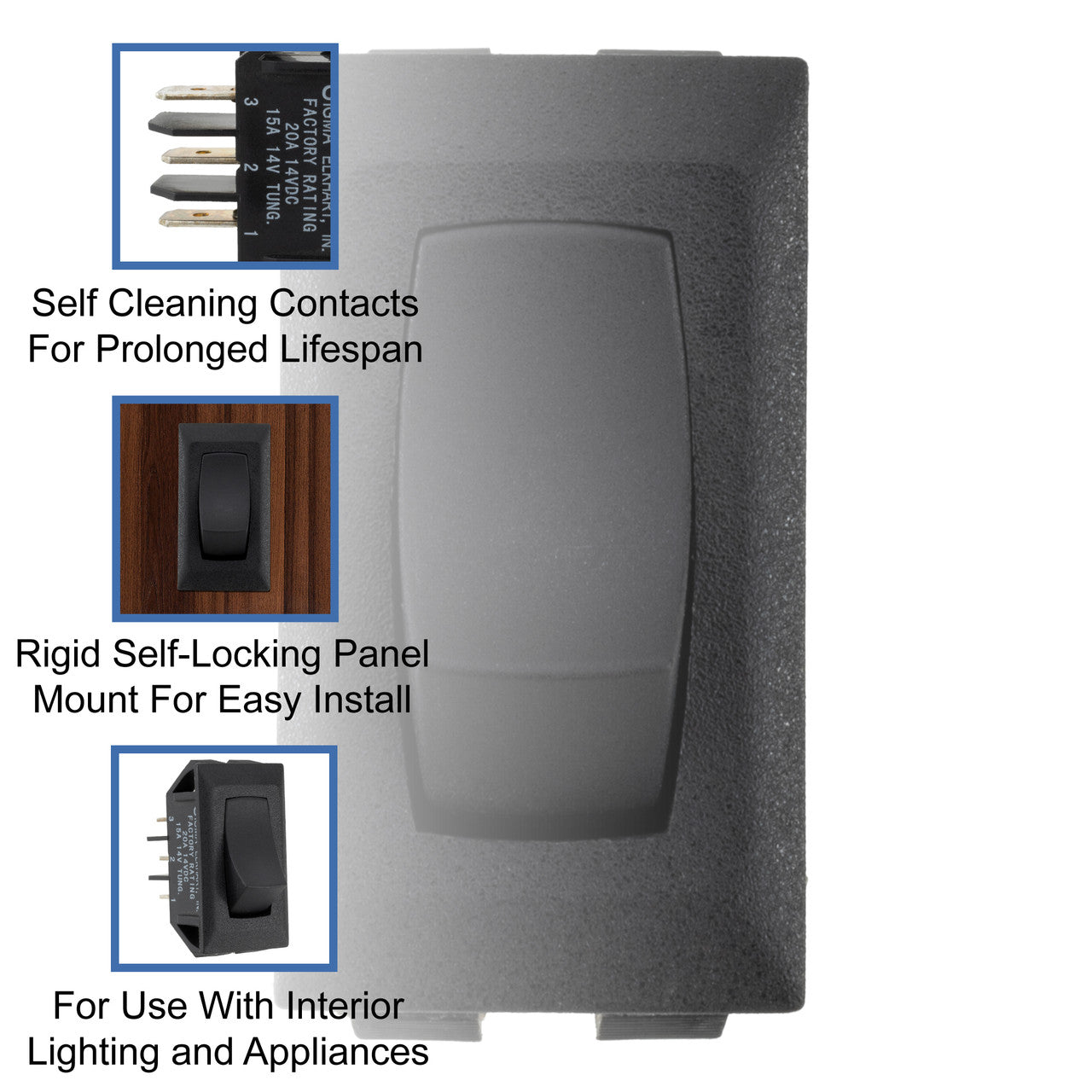 Let Factory RV help you enjoy life on the road with our Momentary Push Switch. Your home, RV, or camper is filled with switches, and it's only a matter of time before you notice the faulty functionality. It happens. If you're trying to downgrade the number of switches without causing issues, this switch will be just what you need, thanks to its SPDT (single pole, double throw) configuration. The self-cleaning contacts will reduce the buildup of corrosion and dust, allowing for simplified maintenance and long-lasting durability, even in the face of road vibrations, fluctuating temperatures, potential moisture, and exposure to UV rays. The easy self-locking panel mount will help make installation easy, allowing you to install the switch without the need for additional tools or hardware. You're looking at a switch rated for 12V, providing you with peace of mind when trying to limit power consumption without sacrificing functionality or reliability. This switch will be perfect for your interior lights and appliances, enabling you to create the ideal setup for your specific needs. For your safety, we've designed this switch with fully enclosed active switching elements, ensuring greater safety by eliminating exposed components that could create risks. Choose between a black or white finish for the switch that best complements your interior and matches your decor and style.