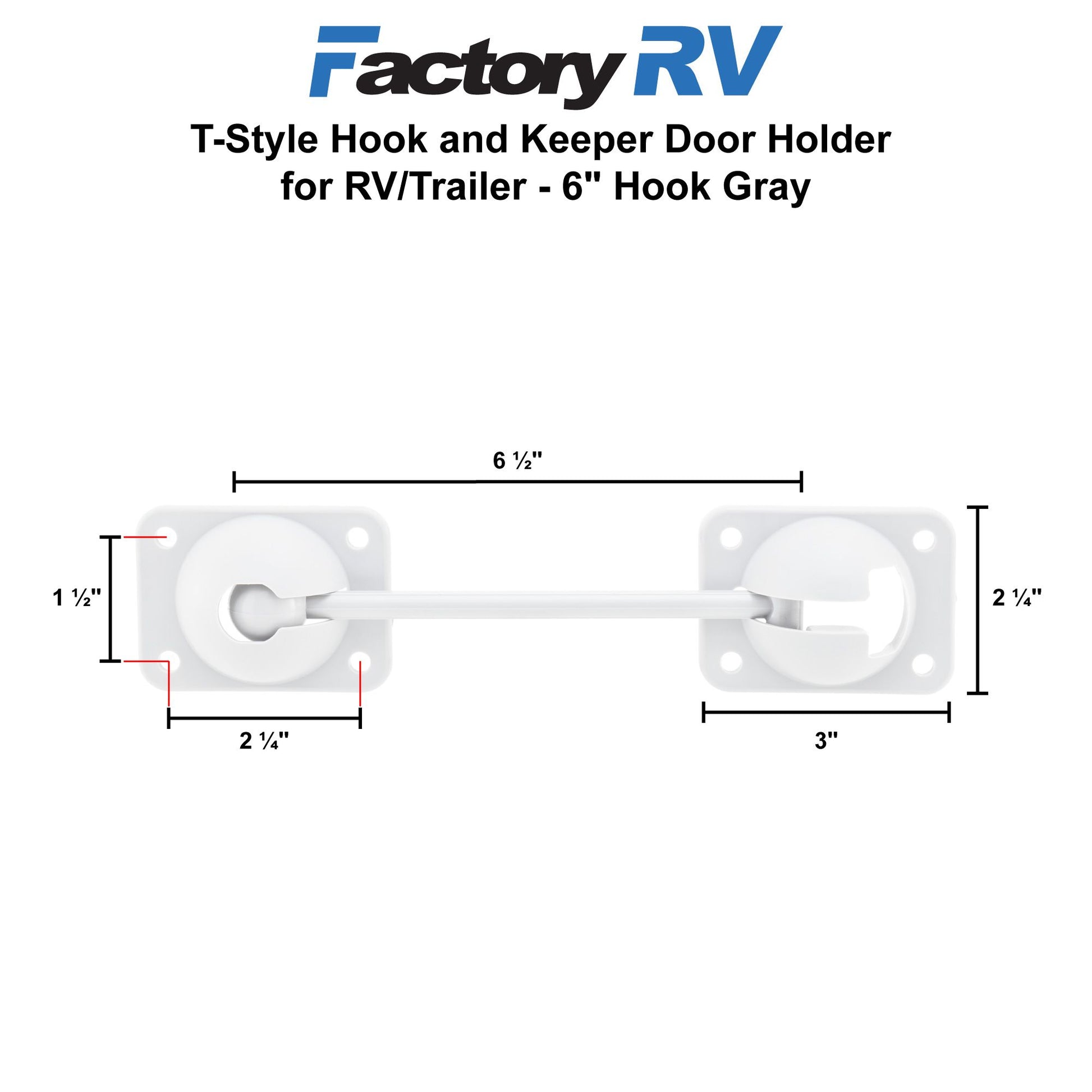 Factory RV's White Door Holder will help support your door when you load and unload. Whether hanging out at the campground or on the road, you'll spend time loading and unloading gear, chairs, and other items. Your RV is a chance to get away from adulting and responsibilities for a bit, and asking for help holding the door can take longer than necessary. Our door holder is made from sturdy plastic to withstand outdoor conditions, ensuring long-lasting durability and performance. The ball-socket connection will add flexibility when you're latching and unlatching, allowing for easy and secure use while maintaining its reliability. With a T-hook and keeper design, this door holder will be sturdy enough to avoid unexpectedly closing, making it easy to load, unload, or crack open the door to let in some air. For a touch of style, it's not just about functionality when it comes to your RV, the sleek white color will blend seamlessly with your RV or trailer exterior, maintaining a professional look.