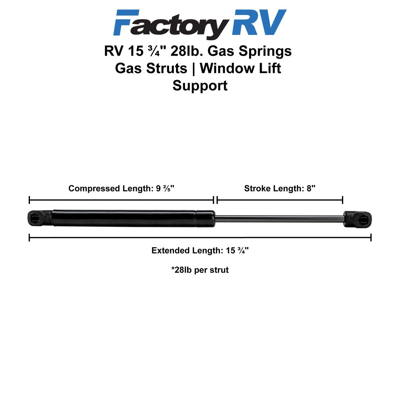 If you want to upgrade or repair your RV for smoother movement, look no further than Factory RV and our 28lb Gas Springs. Coming in a two-pack, you can invest for an immediate upgrade or stock up for repairs further down the road. When it comes to our gas springs, this product will solve the requirements for opening, closing, tilting, and damping flaps, tables, seats, or loungers. Our gas springs will also act as window lift support for controlled movement. There's no need to worry about the finer details in your RV, not when you can invest in Factory RV and our 2-pack of gas springs. It's easy to install with a compact design and integrated damping, so you can invest in a quality product for long-term use.