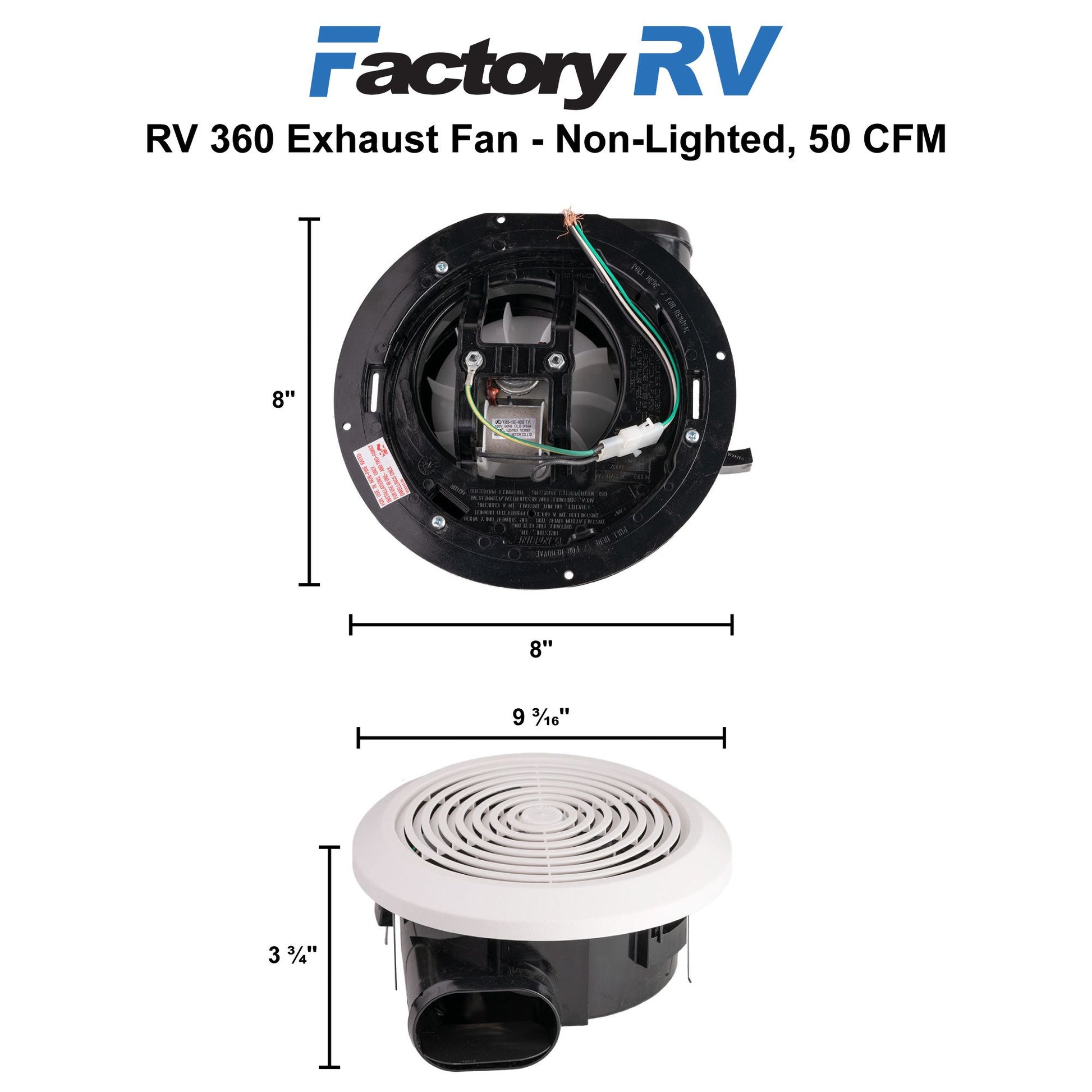 Air gets stale and stuffy; sometimes, opening a window isn't enough to get it moving. Sometimes, you need a helping hand, and that's where Factory RV comes in to help. Whether it's smoke, humidity, or stagnant air, you'll want to invest in our 360 Exhaust Fan. With a capacity of 50 cubic feet per minute, this fan exhausts stale air, moisture, and odors to provide a fresh, comfortable environment inside your home. This fan is designed for side exhaust, removing excess air without built-in lighting and focusing on optimal airflow to keep your space well-ventilated and comfortable. You're looking at a high-quality product designed for long-lasting durability and reliability. This fan is constructed with heavy-duty, weather-resistant plastic to withstand outdoor conditions. The classic white will blend well with your home's exterior, creating a product that combines style with functionality.